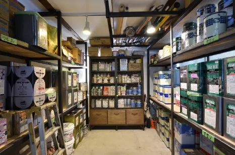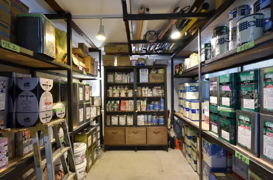 塗料の棚と工具類の収納等、