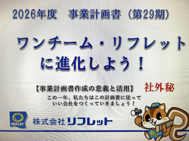 又、来年度に向けて、事業計画の立案に取りかかるのもこの時期からです。早速、スローガン、一年の骨子として「ワンチーム・リフレット」を社内全体ミーティングの中でプレオープンしました。4月に向けては、ちょっとフライングですが、いいんです。本気度がみんなにより伝わり、行動化出来る事が何よりです。