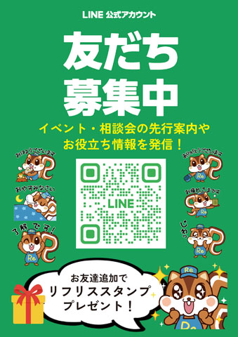 この公式LINEアカウントからは生活のお役立ち情報やイベント情報などを配信させて頂きます。そして、リフレットのマスコットキャラクターであるリフリスくんのスタンプも作成致しましたので、ぜひ友達追加をして、ダウンロード頂き、使ってみてください!