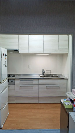 6年前にトイレ交換工事をさせていただいたお客様です。現在のL型キッチンをI型に変えたいとご相談いただきました。
