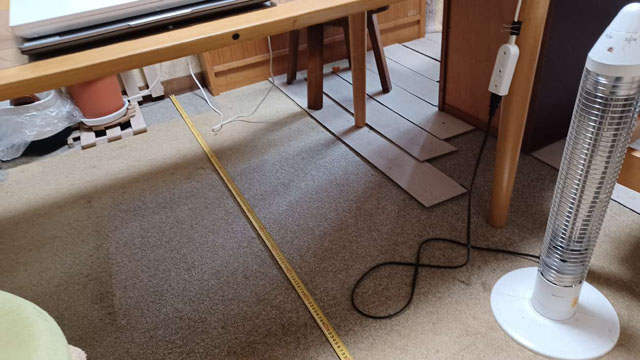 1年前に外壁補修工事をさせていただいたお客様です。今回はリビングの床をカーペットからフローリングにしようと思い、フロアタイルを敷いてみたが、うまくいかないかなかったとご相談いただきました。